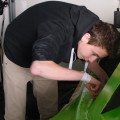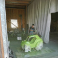 Nach der Grundierung kleben Andrea, Lukas und Michael Autoteile ab und beginnen zu lackieren. Grün, Schwarz, die Startnummer 7, …